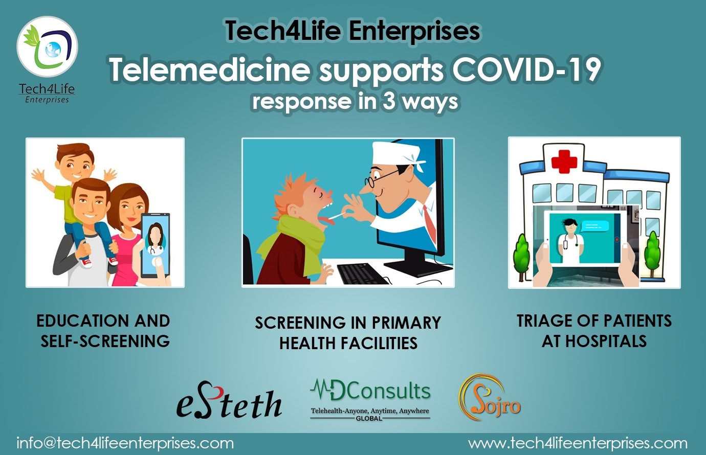 Tech4Life provides state of the art Telemedicine solution (MDConsults) and the Digital Health devices, like Sojro Telemedicine kits and eSteth Lite Digital Stethoscope to provide affordable solution to COVID-19 spread. Telemedicine response can be implemented in three ways: